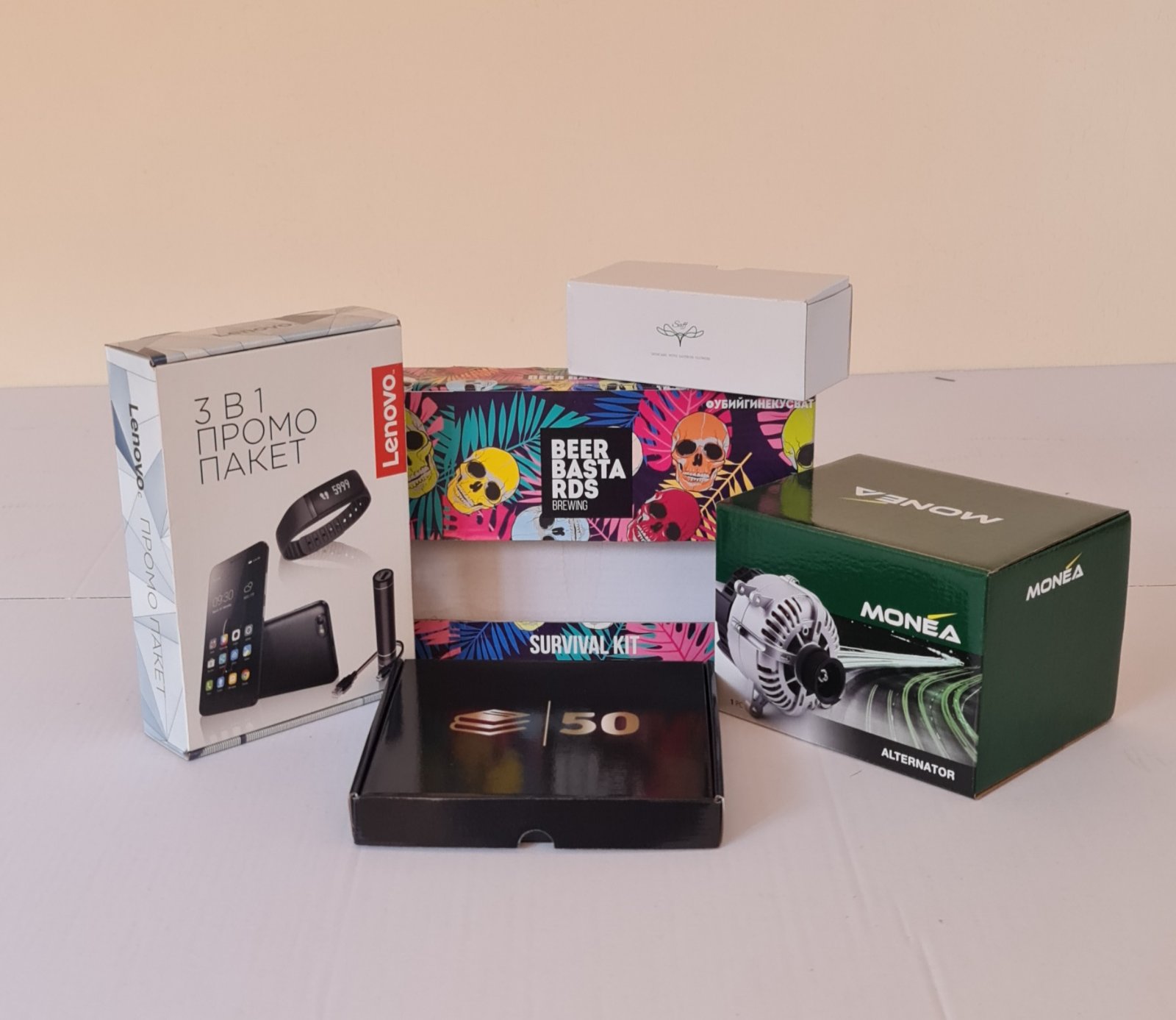 Предлагаме брандиране на опаковките с флексопечат до 4 цвята върху бяло или кафяво велпапе, както и каширане на изделията с картон и пълноцветно изображение.